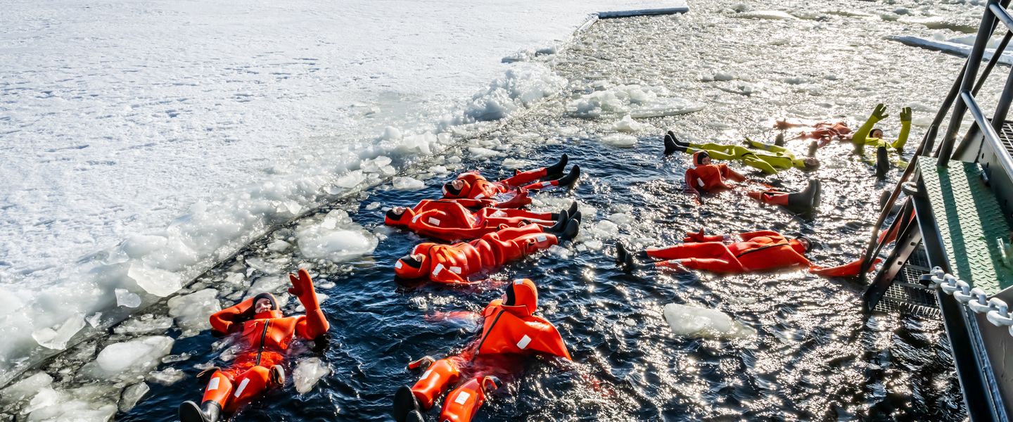 Thermo-Kleidung für die Aktivitäten sowie der Floating-Anzug auf dem Eisbrecher wird vor Ort gestellt.