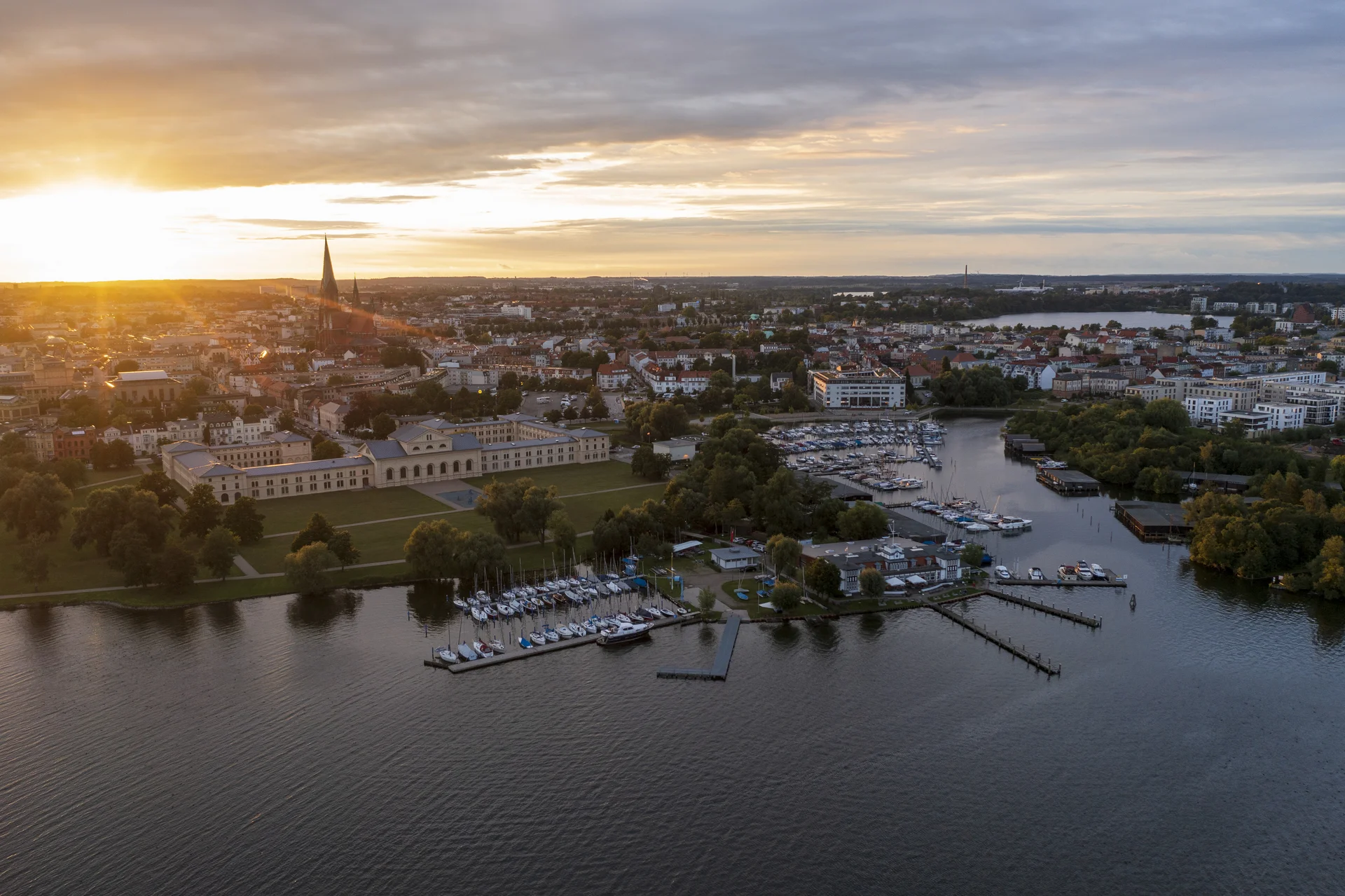 Seit ihrer Gründung durch Heinrich den Löwen ist die älteste Stadt Mecklenburgs immer der Mittelpunkt dieses Landes gewesen. Eingebettet in eine idyllische Wasserlandschaft, wird die Stadt seit jeher von den blauen Seen dominiert, die ein Viertel der Stadtfläche einnehmen. Das imposante Schloss "schwimmt" mitten im Schweriner See und erhebt sich märchenhaft, anmutig und filigran aus Deutschlands viertgrößtem See, stolz und voller Würde.