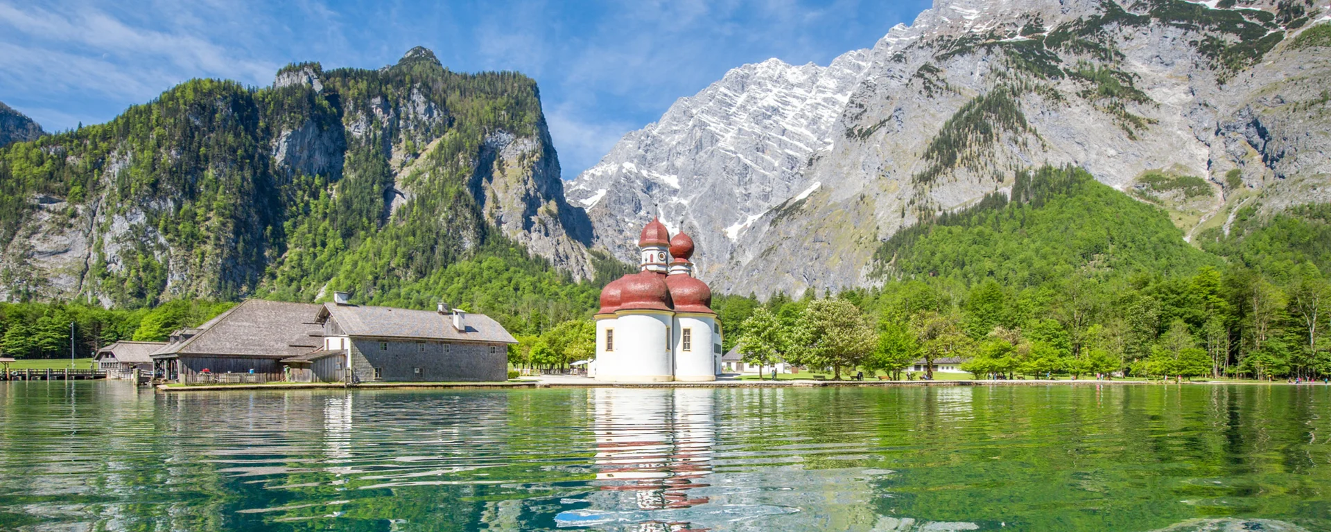 Eingebettet zwischen majestätischen Gipfeln liegt der smaragdgrüne See. Das Highlight des Tages ist die Schifffahrt über St. Bartholomä bis nach Salet Obersee. Gemütlich gleiten Sie über den glasklaren See, vorbei an der imposanten Ostwand des Watzmanns. Der Klang des weltberühmten Königssee-Echos, das die Schiffe erzeugen, verleiht dieser Fahrt eine magische Atmosphäre. Die idyllisch gelegene Wallfahrtskirche St. Bartholomä mit ihren charakteristischen roten Zwiebeltürmen kann auf dem Weg besichtigt werden.