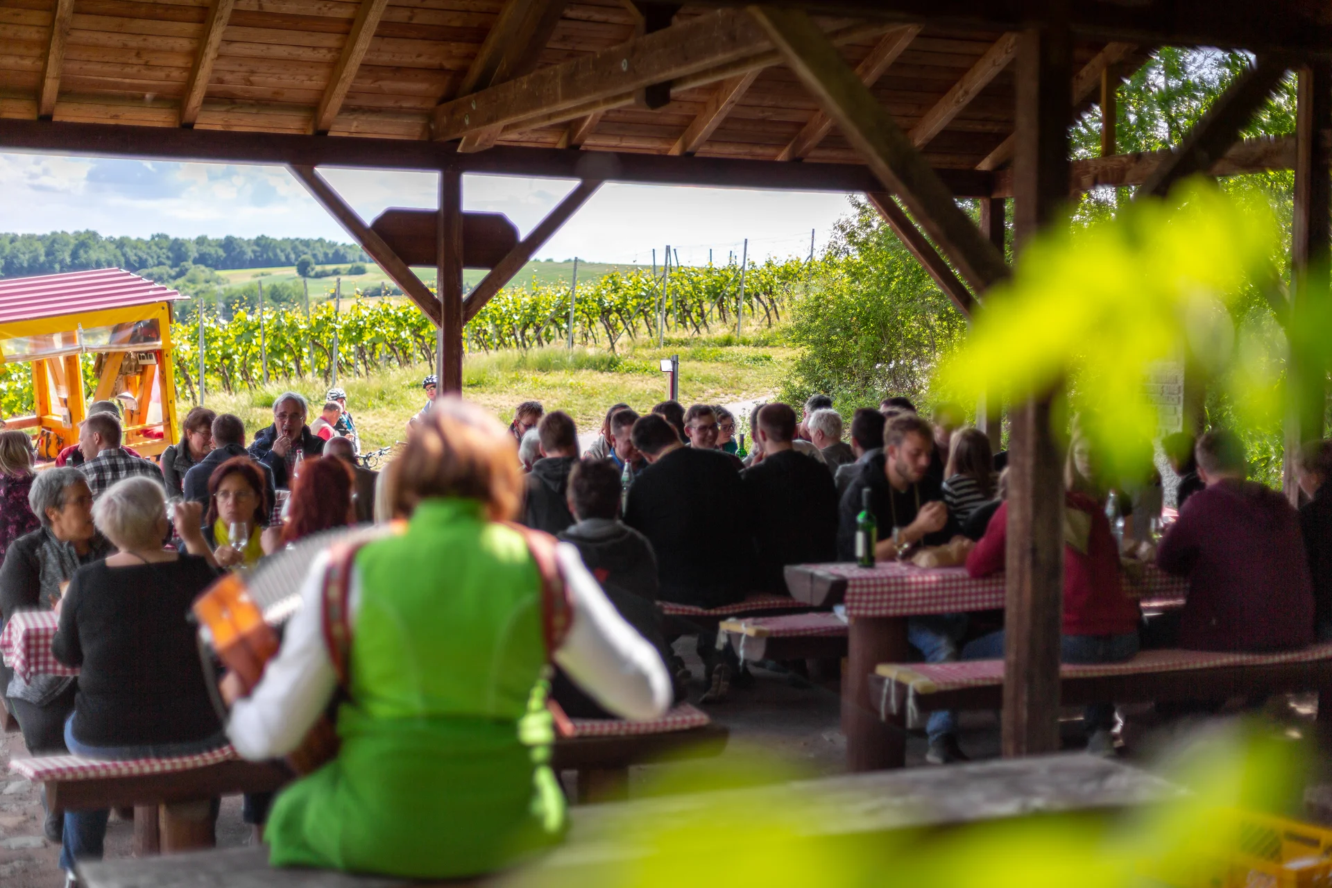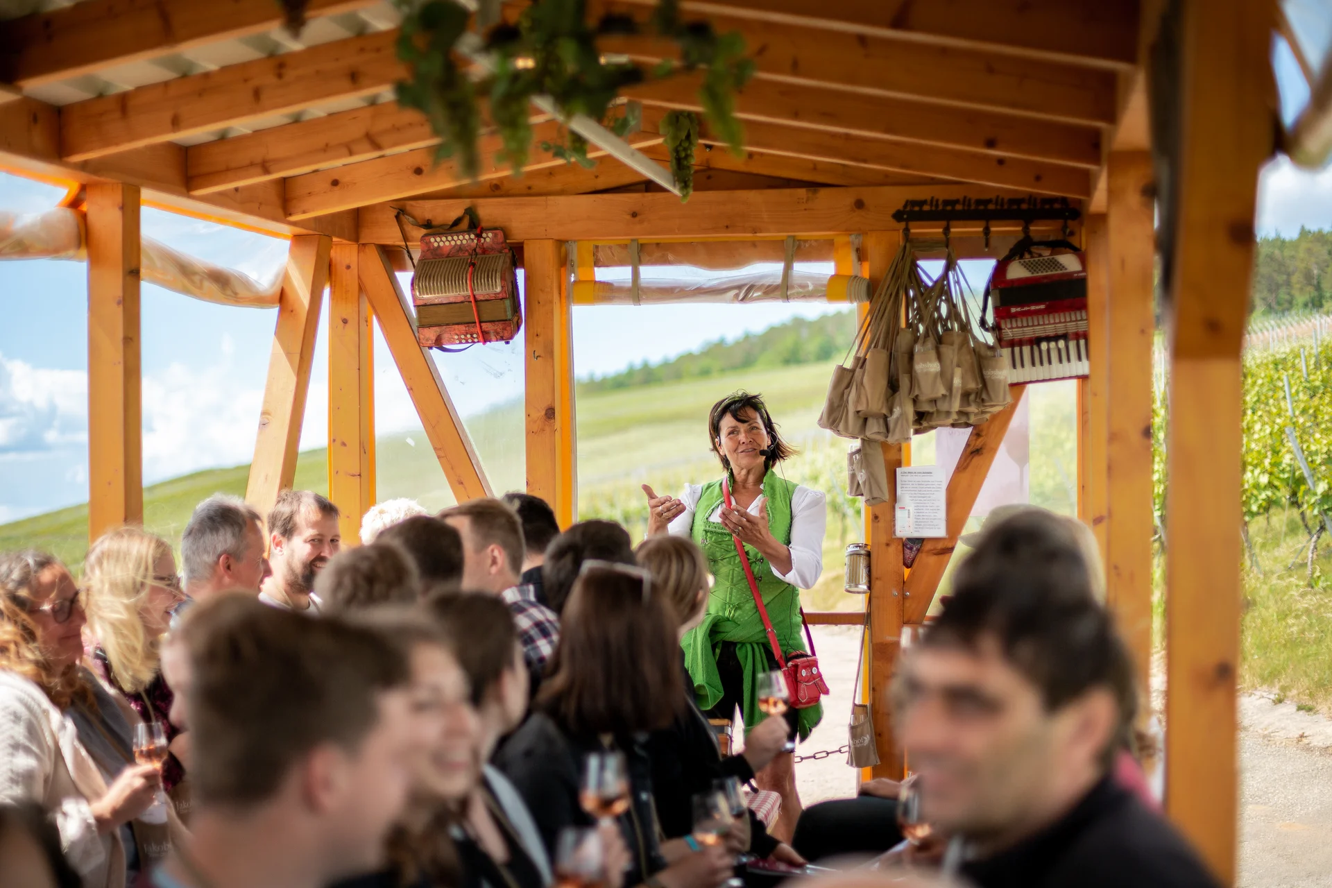 Entdecken Sie Markelsheim auf einer Panoramafahrt 'hoch auf dem Gelben Wagen'. Weinverkostung über den Weinbergen mit Akkordeonmusik – unvergesslich!
